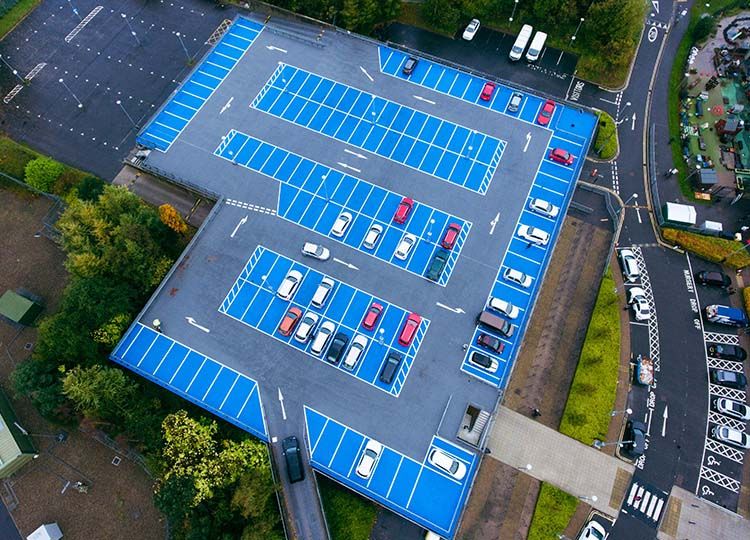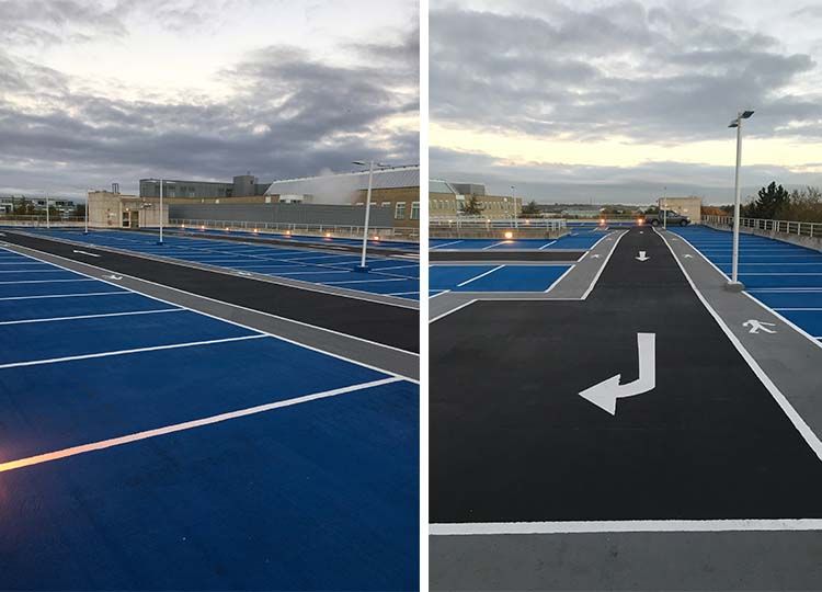 The works took place in the summer of 2021. The durable surface finish of the cold liquid applied PMMA Triflex ProPark system incorporated colours of Traffic grey for the drive aisles, with parking areas in Traffic blue. Bay marking was completed with white Triflex Preco Line 300, and direction arrows completed with white Triflex Cold Plastic, a PMMA system capable of withstanding the rigours of heavy traffic.